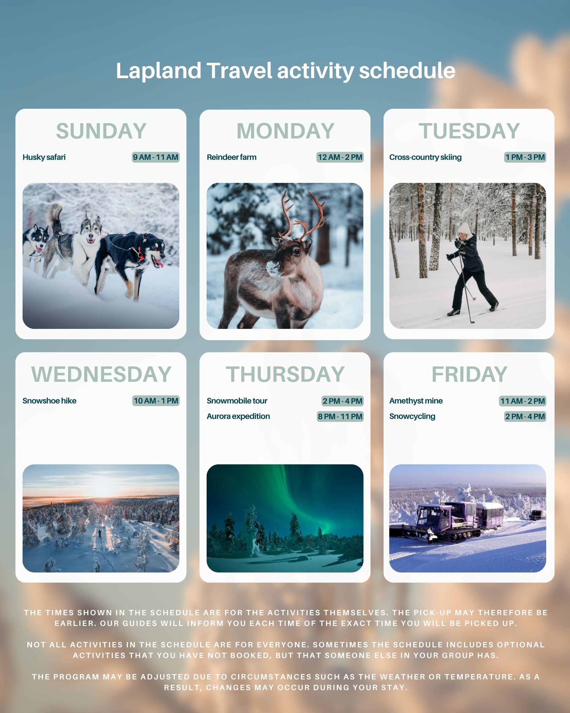 This schedule is an example: it can vary from week to week depending on the time slots agreed upon with our local partners, but it gives you a clear idea of what your week in Lapland with us and our English-speaking guides could look like.